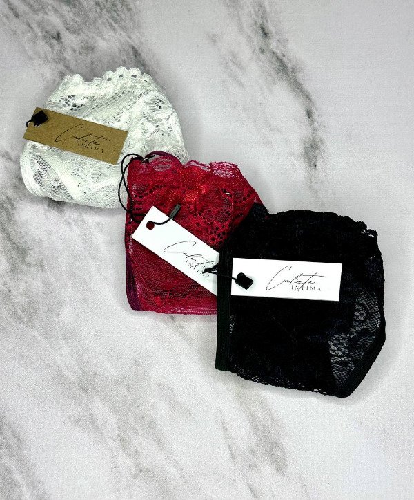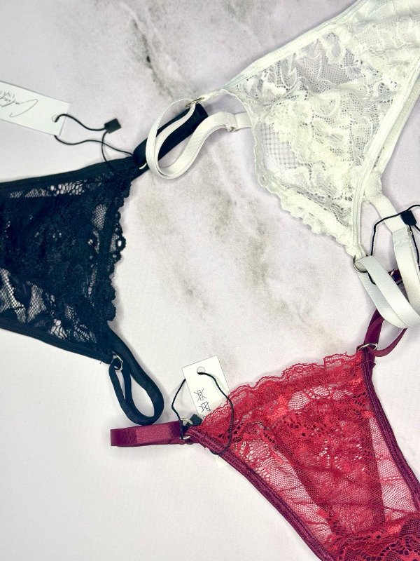 DETALLES DE LA PRENDA: Pack de tres less regulable de puntilla de color negro, blanco y bordo.