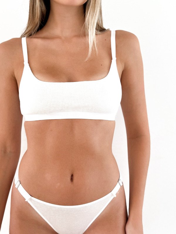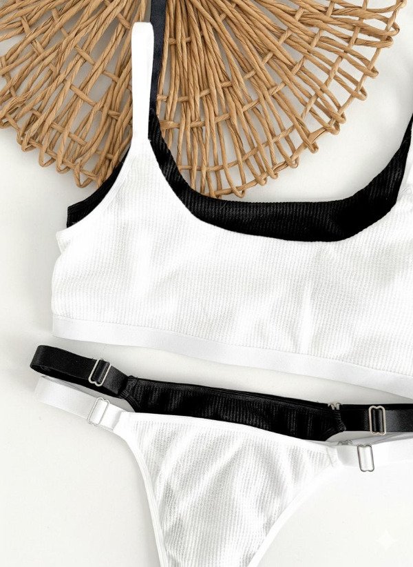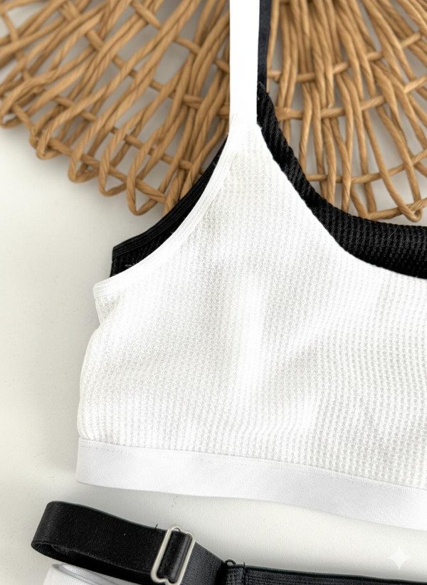 DETALLES DE LA PRENDA: Conjunto con corpiño recto de algodón con forrería interna, espalda escotada con prendedor y less de algodón con breteles anchos regulables.-